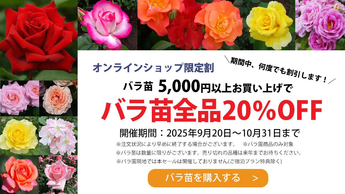 - 2025.09.19 【オンライン限定】秋の大感謝祭!バラ苗5,000円(税込)以上お買い上げでバラ苗全品20%OFFキャンペーン!【2025年9月20日~10月31日まで】