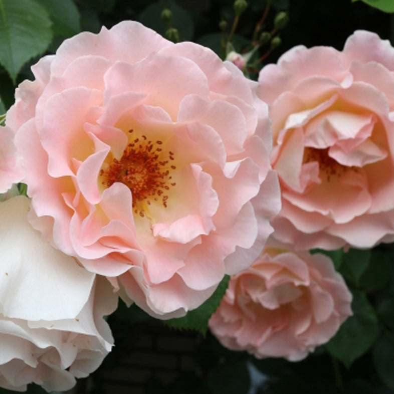 繊細な色彩と波打つ花弁が優美な人気品種です。伸長力に優れています。寒冷地では優れたブッシュローズとしても重宝します。フェンスやトレリスに誘引したり、壁一面に咲かせて楽しめます。