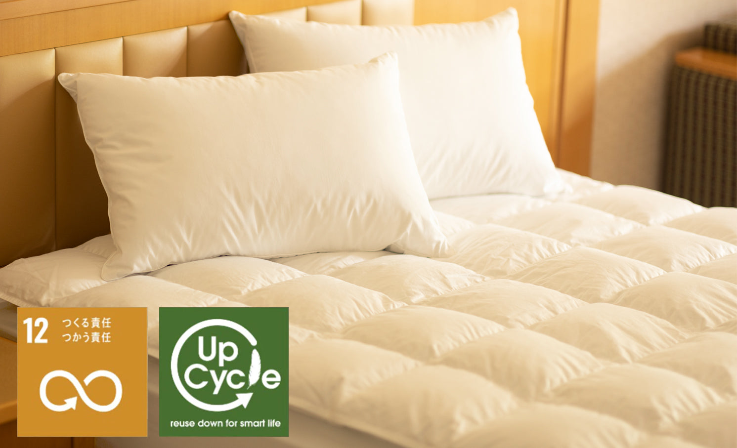 焼却処分される手前の羽毛ふとんを回収、羽毛を取り出し、富士山系天然水で清潔に洗浄したサステナブルな羽根、羽毛、アップサイクルフェザー、ダウンを詰め物に。ダニや雑菌の心配もなく、安心してご利用いただけます。花巻温泉 佳松園はアップサイクルダウンの取り組みに賛同し、協力をしています。