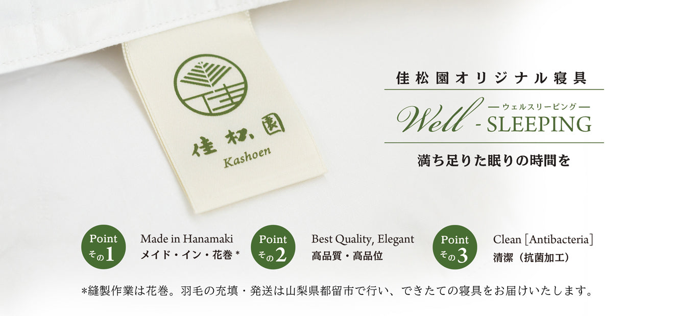 佳松園の満ち足りた眠りの時間をご自宅で。完全受注生産で清潔感・高級感のある作りたての寝具をお届けいたします。