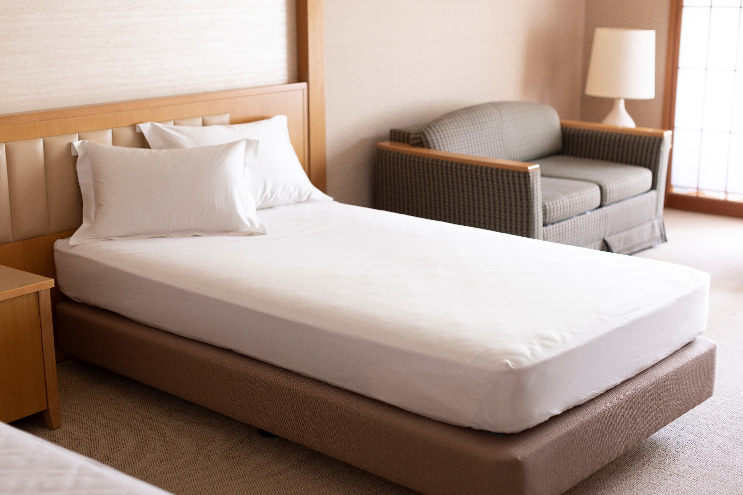 佳松園全室で採用 佳松園オリジナルボックスシーツは、大きなサイズでも生地のはぎ合わせはしてないため、縫い合わせた部分が身体に触れることはなく気品ある光沢と肌触りに仕上がっております。