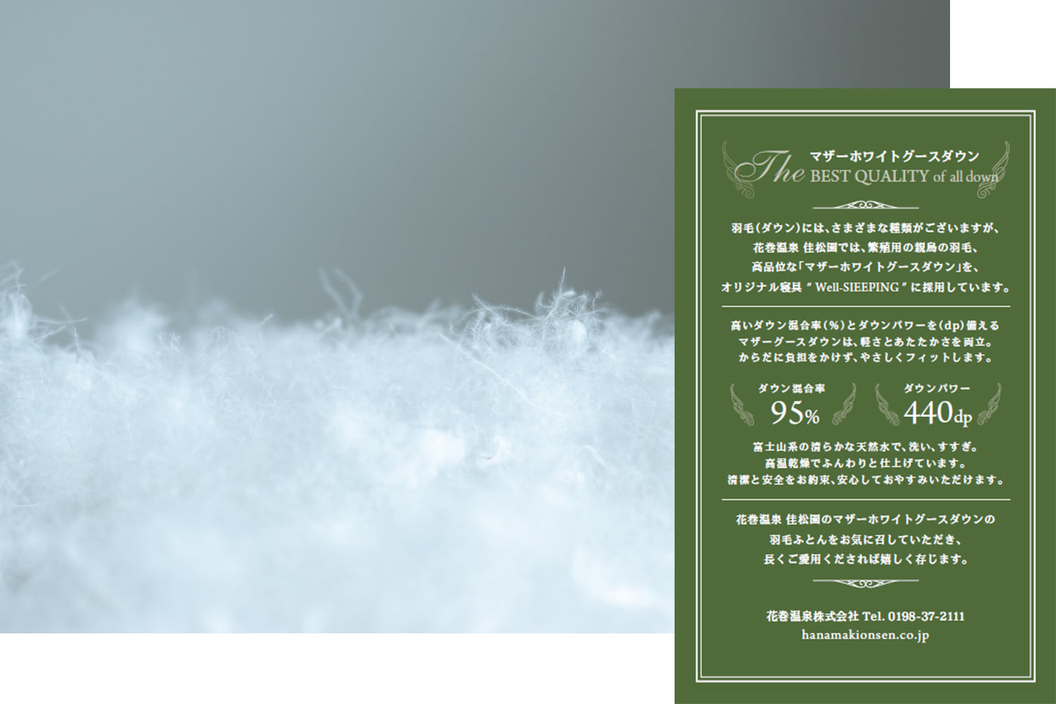 花巻温泉 佳松園では、繁殖用の親鳥の羽毛、高品位な「マザーホワイトグースダウン」をオリジナル寝具 “ Well-SLEEPING ” に採用しています。